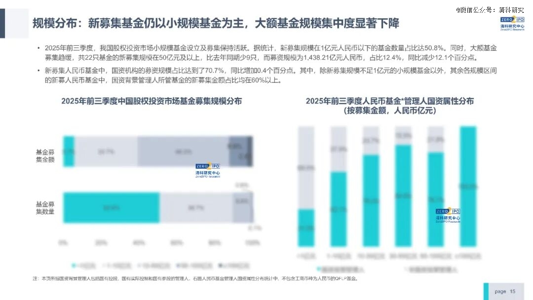 募资方面,2025年前三季度新募集基金数量和规模分别为3,501只,1.16万亿元,同比上升18.3%、8.0%。前三季度政府投资基金、地方国资平台、险资、AIC活跃出资,发起设立多只基金支持募资市场回暖。分币种看,人民币基金主导地位进一步提升,外币基金募资延续下滑态势,前三季度共17只外币基金完成新一轮募集,募集规模近240亿元,同比分别下滑55.3%、56.9%。