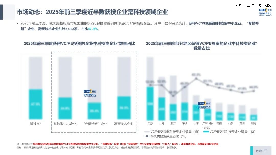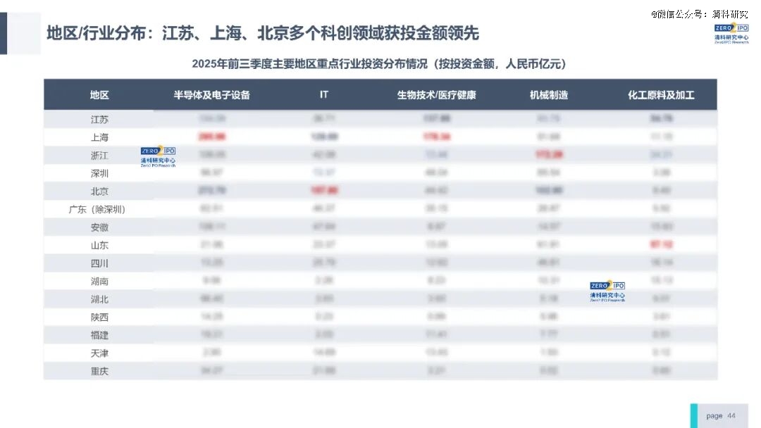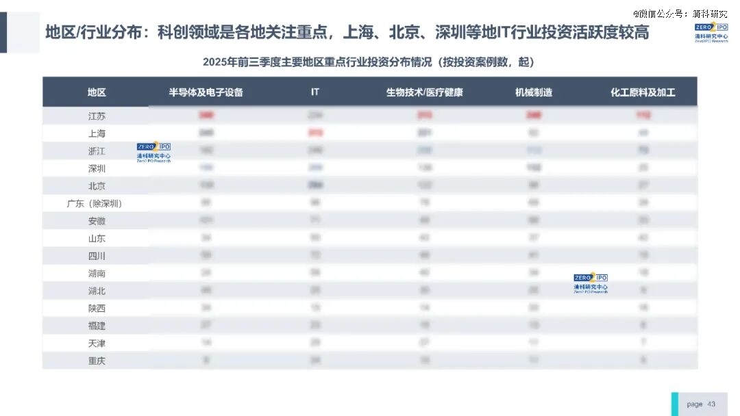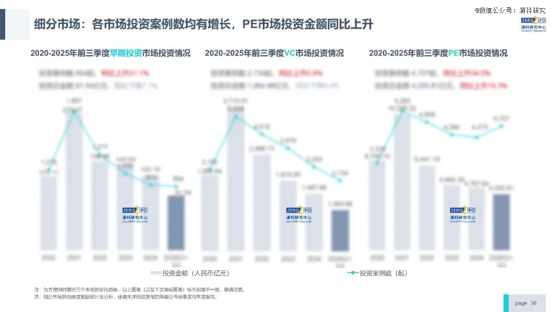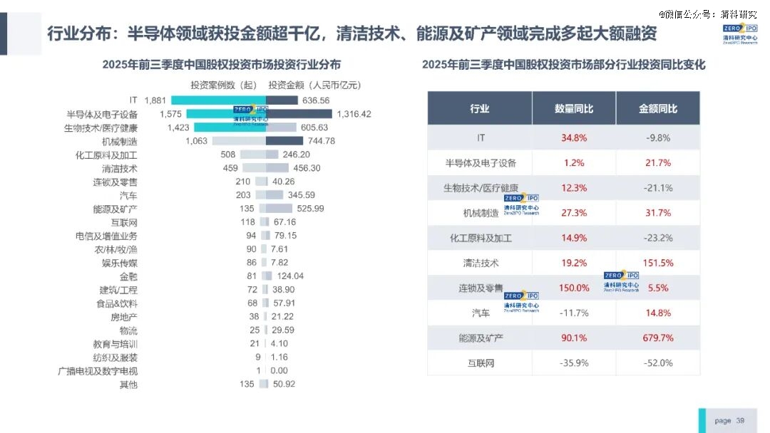 投资方面,2025年前三季度投资案例数共8,295起,披露金额5,407.30亿元,分别同比上升19.8%、9.0%。分行业看,硬科技领域获得市场较高关注,IT、半导体、生物技术/医药健康、机械制造等领域投资案例数量均超千起,AI、GPU、创新药、智能制造等细分领域热度较高。
