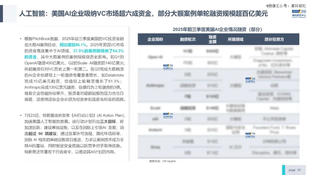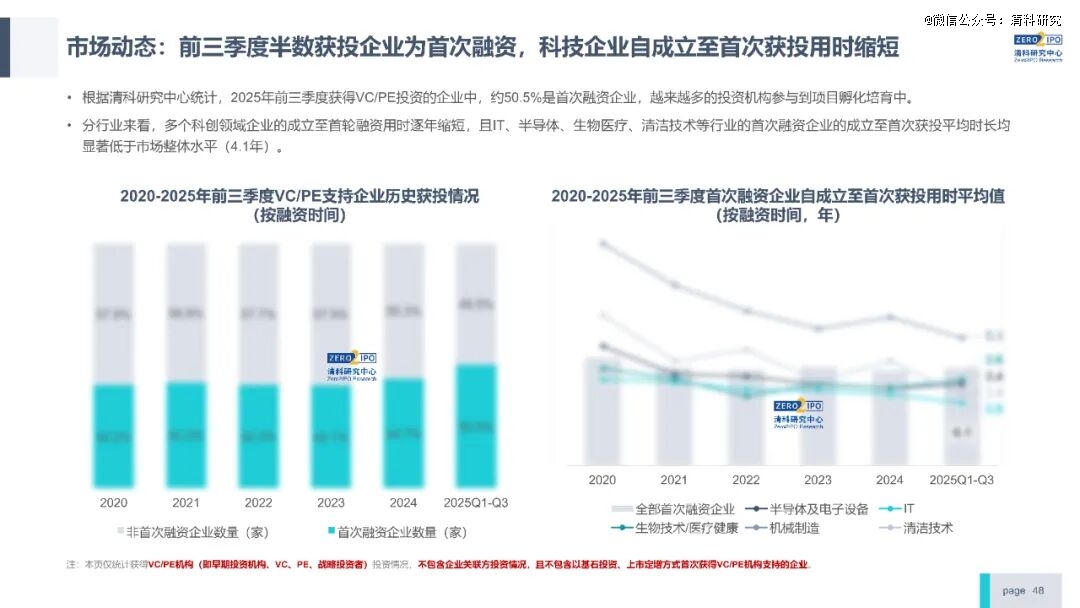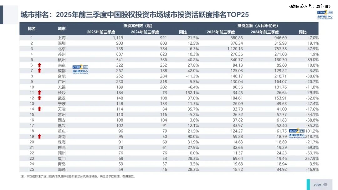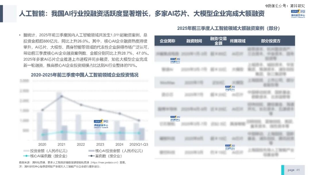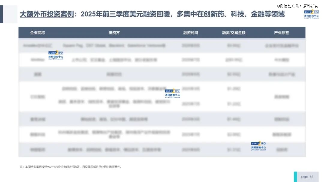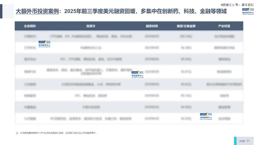 投资方面,2025年前三季度投资案例数共8,295起,披露金额5,407.30亿元,分别同比上升19.8%、9.0%。分行业看,硬科技领域获得市场较高关注,IT、半导体、生物技术/医药健康、机械制造等领域投资案例数量均超千起,AI、GPU、创新药、智能制造等细分领域热度较高。