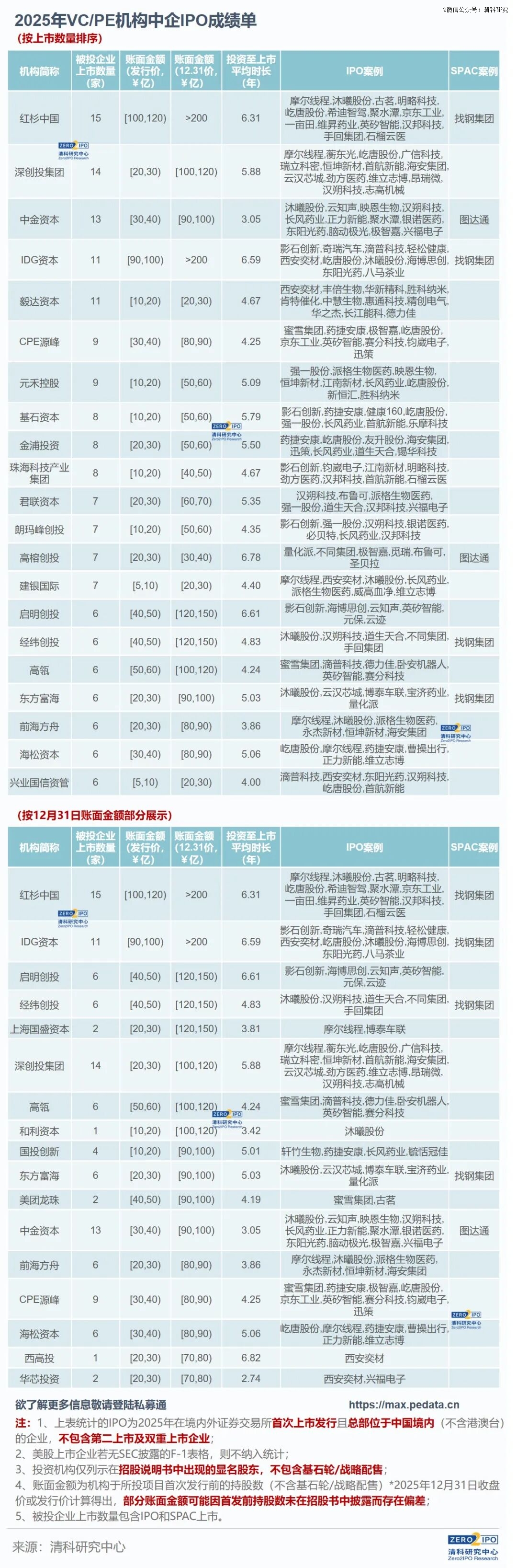 综合来看,相较2024年,2025年随着IPO新股发行节奏常态化,VC/PE机构被投 中企IPO方面呈现诸多变化。其一,头部机构收获IPO项目数量明显增长,账面金额表现良好。若包含SPAC上市在内,2025年共5家VC/PE机构收获超10个IPO,而2024年仅1家;同时,本年度共26家机构收获5个及以上IPO,2024年为17家。账面金额方面,按年末收盘价计算,2025年持有新增IPO项目账面股份价值排名前10的机构合计持有账面金额达1,457.25亿元人民币,远高于2024年的465.37亿元。需要注意的是,IPO项目账面金额存在波动,此处的统计为估算值,机构实际退出价值以最终减持金额为准。