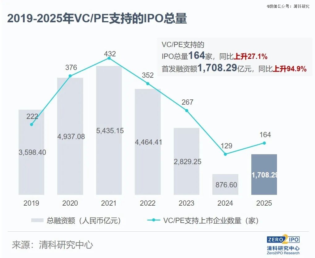 根据清科控股(01945.HK)旗下清科研究中心统计,2025年VC/PE支持的中企IPO共164家,背后涉及951家机构,收获被投企业IPO的机构数量同比增加34.5%。若包含SPAC上市在内,2025年共有21家机构收获6家及以上中企上市。