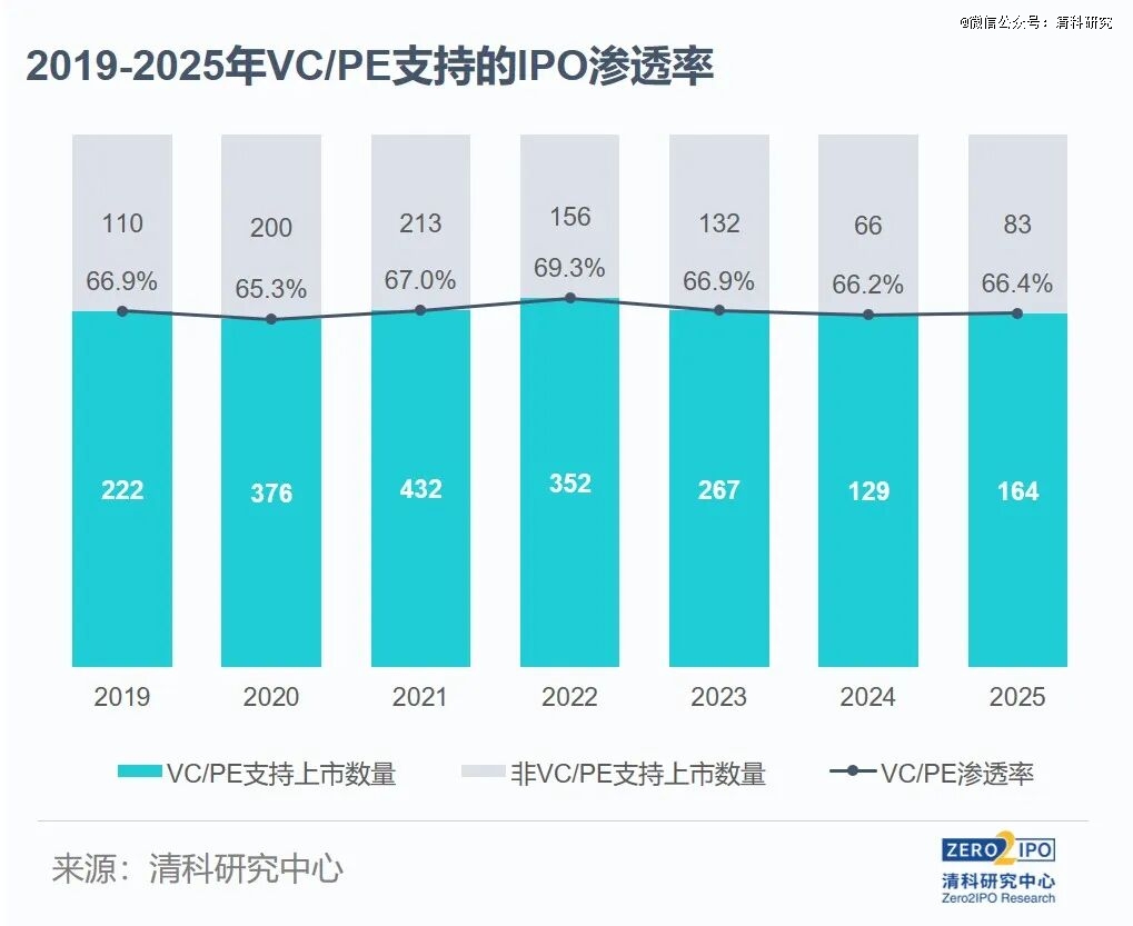 2025年,中企IPO市场VC/PE渗透率约66.4%,较2024年微增0.2个百分点。分市场来看,A股的VC/PE渗透率为76.7%,较2024年增加1.7个百分点;境外市场的VC/PE渗透率为57.3%,较2024年增加0.4个百分点。